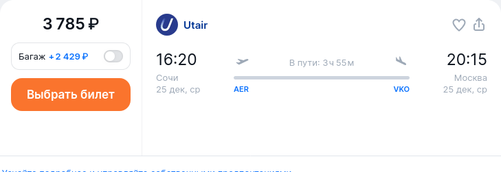 Сочи — Москва за 3785 руб (Utair) Дата вылета: 25 December