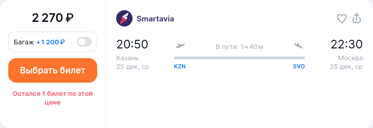 Казань — Москва за 2270 руб (Smartavia) Дата вылета: 25 December