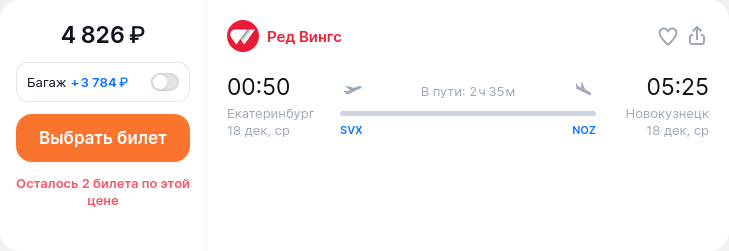 Новокузнецк — Екатеринбург за 4826 руб (Ред Вингс) Дата вылета: 10 December