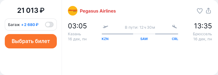 Казань — Брюссель за 21013 руб (Pegasus Airlines) Дата вылета: 16 December