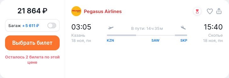 Казань — Скопье за 21864 руб (Pegasus Airlines) Дата вылета: 18 November