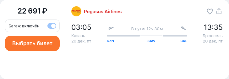 Казань — Брюссель за 22691 руб (Pegasus Airlines) Дата вылета: 20 December